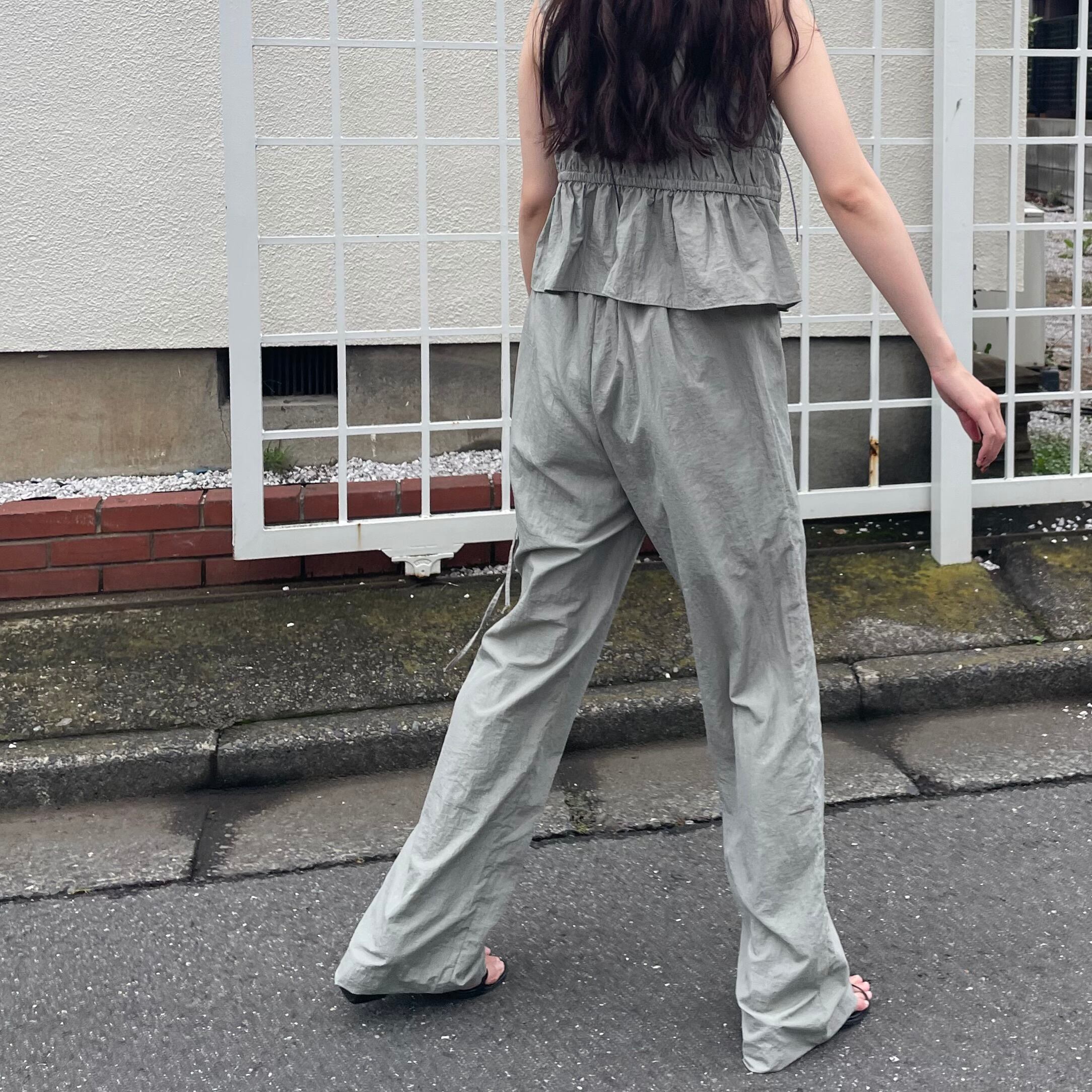 ナイロン素材のSETUP。 TOPS…ティアードデザインで、3段のリボンを絞るとメリハリのある見え感になるのがポイント 。 PANTS…シンプルなデザインですが、ウエストを紐で絞るデザインで左側からリボンが垂れる デザインがポイントです。サイズは自由自在なのでハイウエストでも高身長の方はローウエストで履いても◎ model:161cm ■混率■ ポリエステル65% レーヨン35%